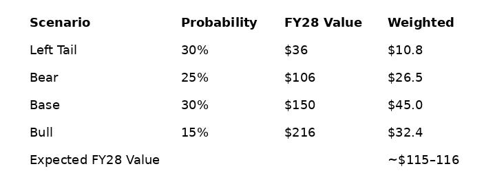 This is no longer about identifying a dislocation. It’s about whether capital should remain here, be increased, or be redeployed - and that requires being explicit about anticipated future returns from today’s price. Running my framework at current prices produces a probability-weighted expected return of roughly ~11–12% annually over the next three years - attractive, but meaningfully below the returns implied when the stock was trading in the low $60’s. The purpose of this update is to show why.